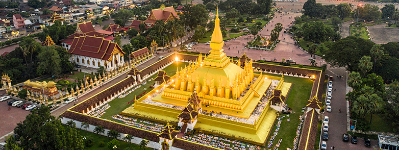 Situated along the banks of the Mekong River, the capical city of Laos, Vientiane offers a unique blend of French colonial architecture, Buddhist temples, and vibrant local markets. Visitors can explore the iconic Pha That Luang, the 16th-century golden stupa that dominates the city skyline, or wander through the bustling streets of Downtown Vientiane to experience the lively atmosphere. The city is also home to Patuxai Victory Monument, a striking war monument that stands as a testament to Laos's struggle for independence from France.