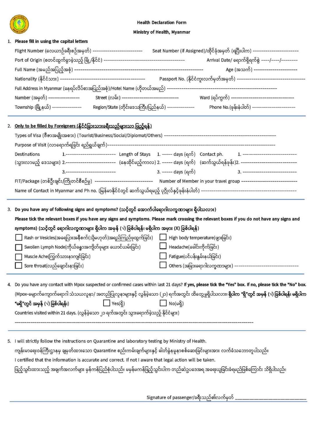 In response to the World Health Organization (WHO) declaring Mpox a Public Health Emergency of International Concern (PHEIC) on 14 Aug 2024, all travelers arriving in Myanmar are required to complete Health Declaration Cards (HDCs) onboard their flight. These cards must be submitted to Ministry of Health (MOH) officials before proceeding through immigration counters.