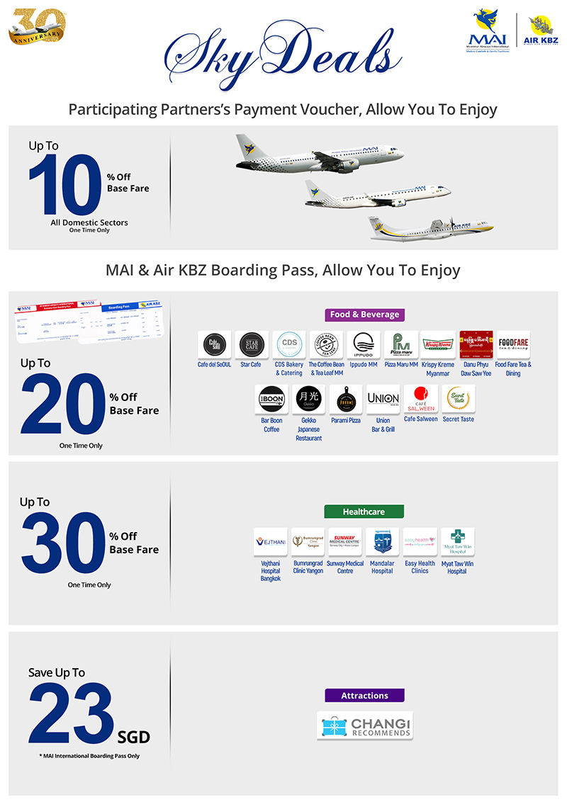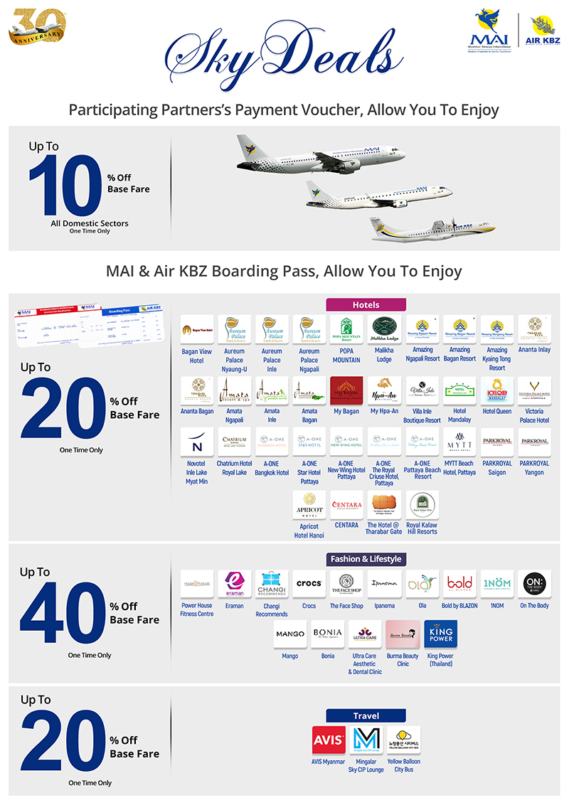 MAI နှင့် Air KBZ ဧည့်သည်များအနေဖြင့် Sky Deals Partners 60 ကျော်တွင် သီးသန့်ခံစားခွင့်များနှင့် လျှော့စျေးများကို ရရှိခံစားနိုင်ပါပြီ